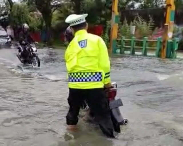 Mantan Panit Lantas Polsek Medan Kota itu berjibaku dengan derasnya air yang menggenangi badan Jalam Dr Mansyur, Medan Sunggal untuk membantu pengendara yang kendaraannya mogok.