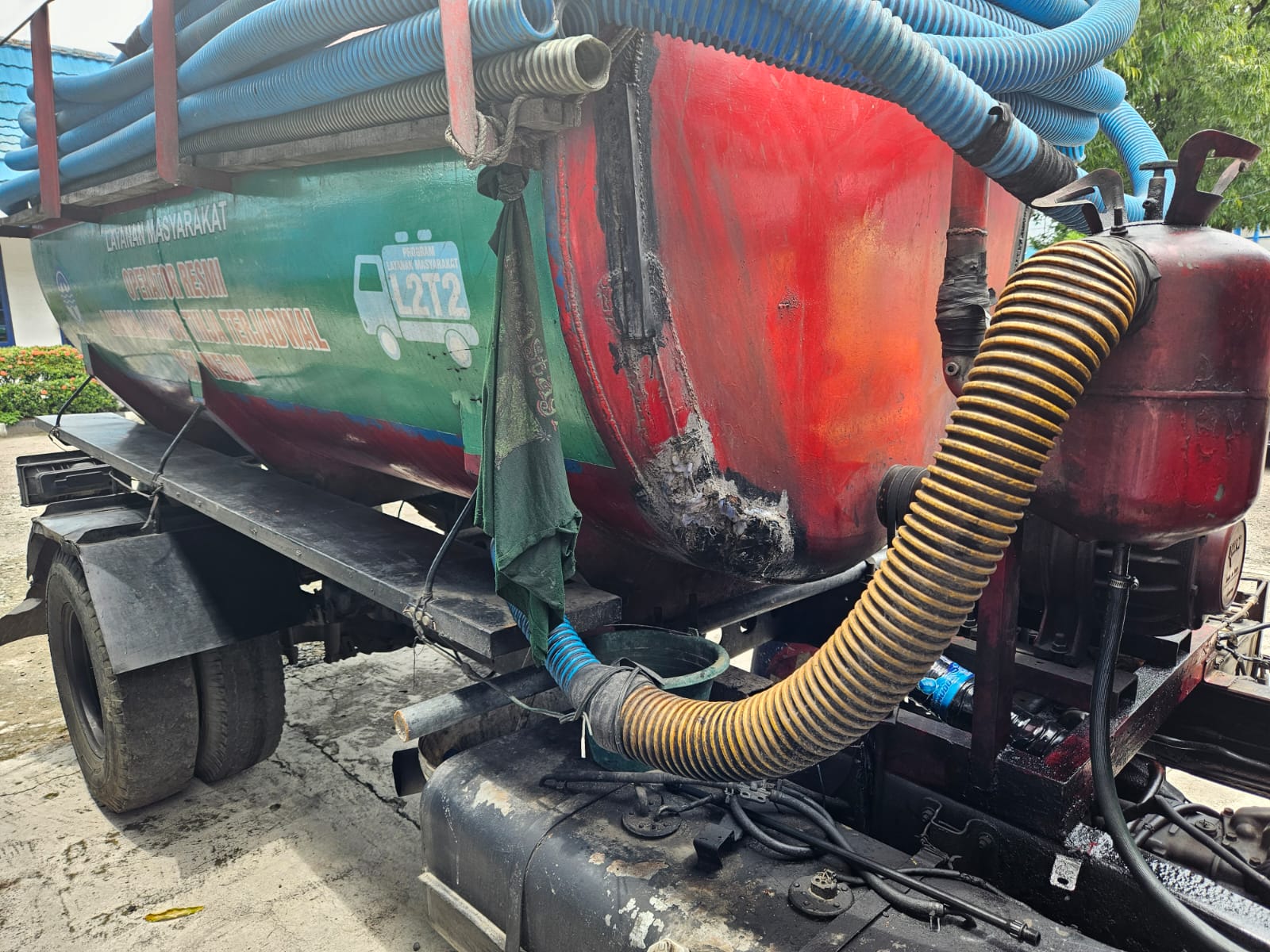 MEDAN, (RAJAWALINEWS) – Perusahaan Daerah (Perumda) Tirtanadi Provinsi Sumatera Utara mengoperasikan atau memakai mobil tangki sedot tinja masyarakat yang tidak layak. Sebab truk tangki milik CV. Berkah Keluarga yang menyedot limbah masyarakat sudah banyak yang rusak, diantaranya tangki bocor ditambal, slang sedot bocor, dan ban gundul yang berpotensi pecah saat beroperasi sehingga membahayakan masyarakat kota Medan.