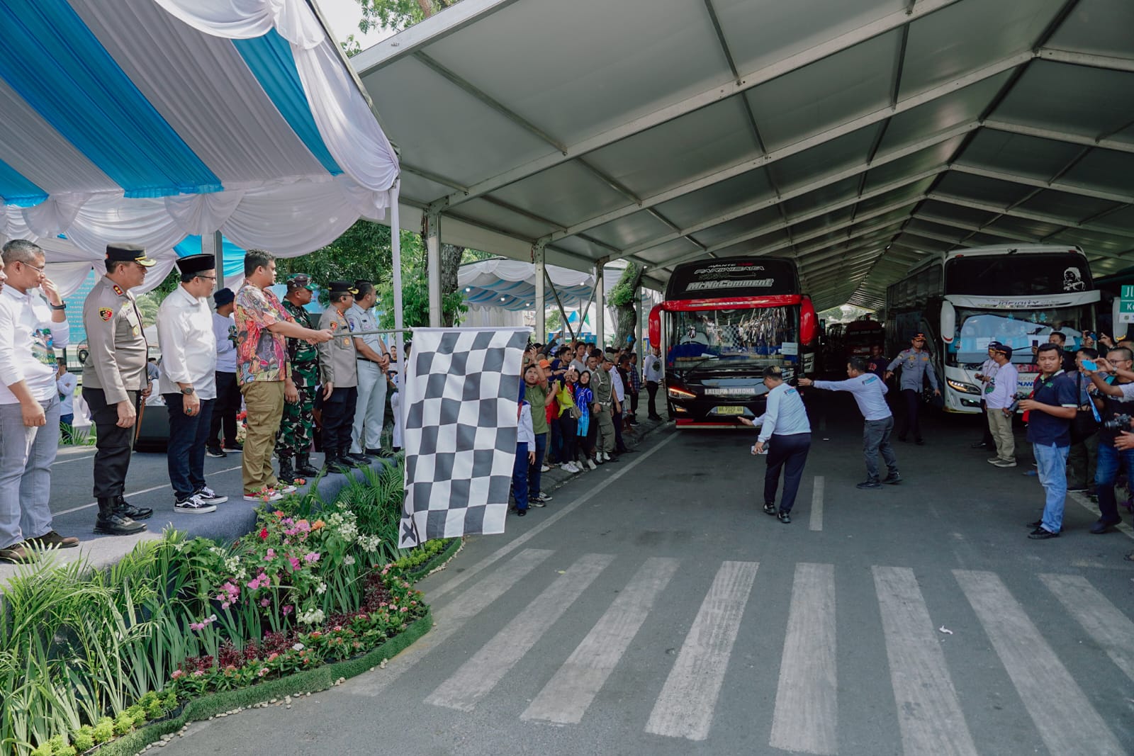 Dengan penuh semangat, Bobby Nasution melambaikan tangan kepada setiap bus yang membawa para pemudik menuju destinasi mereka.