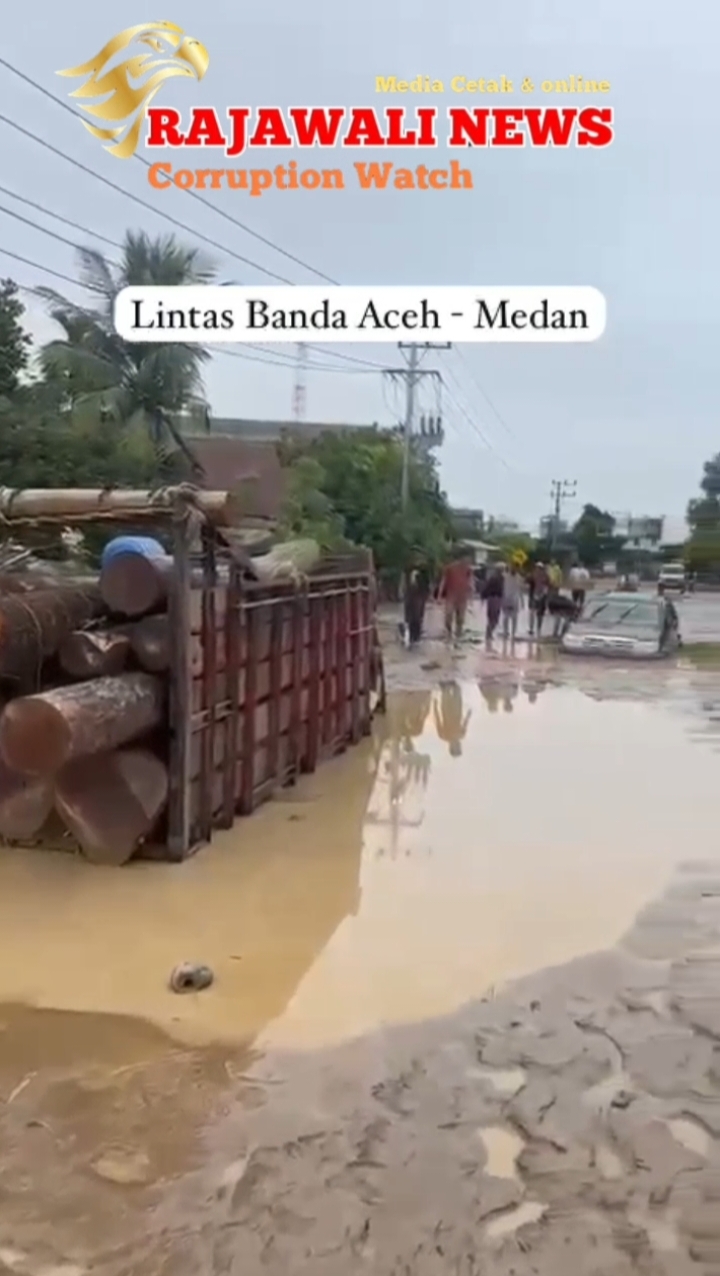 RAJAWALINEWS – Banda Aceh, Kamis, 27 November 2025 — Dua truk bermuatan sangat berat dan satu unit mobil pribadi terbenam di sisi jalan lintas Banda Aceh–Medan setelah ruas jalan tersebut mengalami kerusakan parah akibat banjir bandang yang melanda kawasan itu pada Kamis pagi.