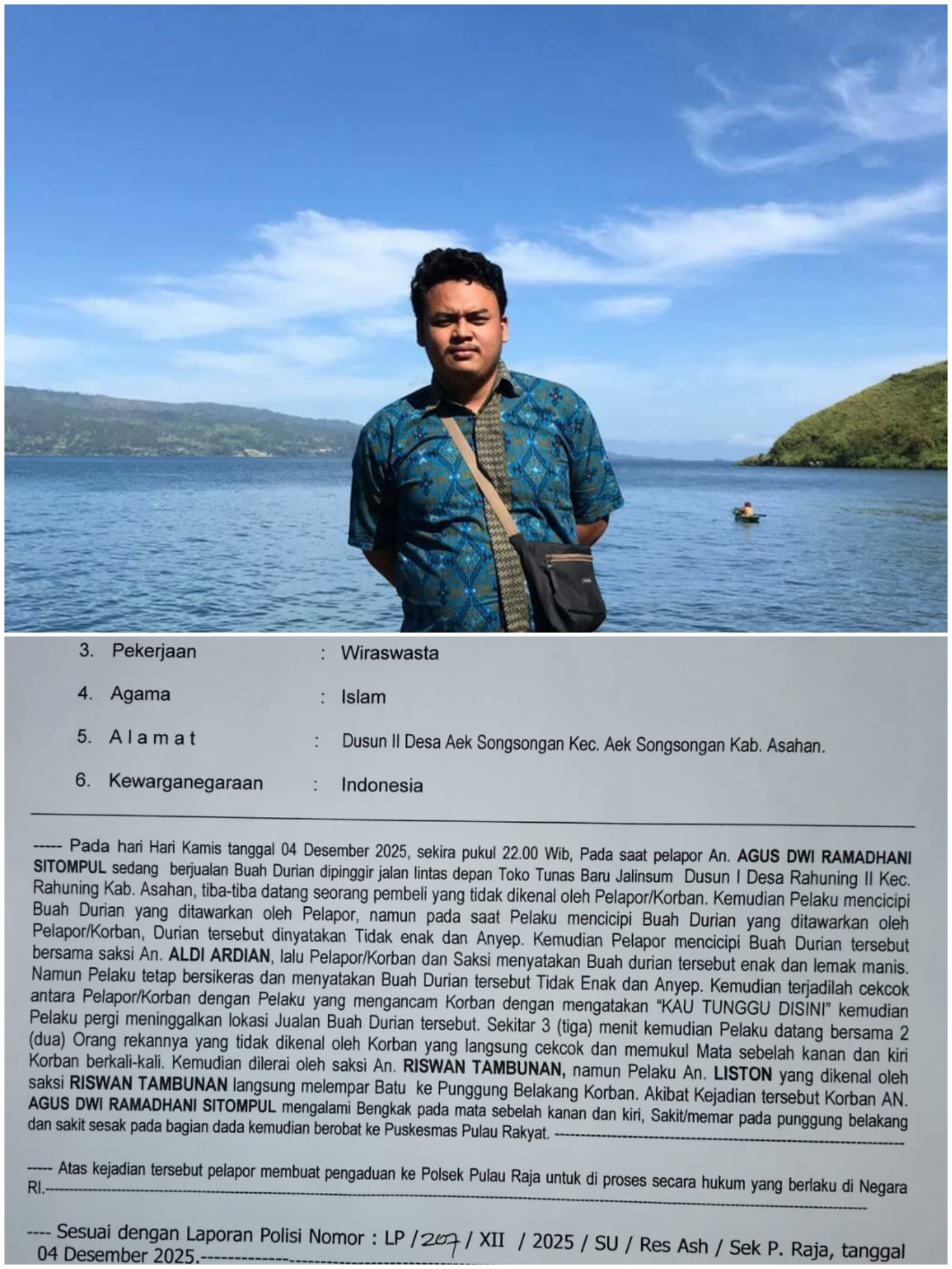 Korban dalam kasus tersebut adalah Agus Dwi Ramadhani Sitompul, seorang pedagang durian yang dikenal warga sebagai pribadi berperilaku baik dan sopan. Menurut keterangan keluarga dan warga sekitar, Agus diduga menjadi korban pengeroyokan oleh tiga orang berinisial LS, BS, dan SS pada Januari 2026 sekitar pukul 00.00 WIB, tidak jauh dari Mapolsek Pulau Raja.