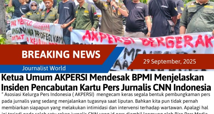 Ketua Umum AKPERSI Mendesak BPMI Menjelaskan Insiden Pencabutan Kartu Pers Jurnalis CNN Indonesia Hukum, Nasional|29 September 2025oleh Muchlis RAJAWALINEWS – Jakarta – Dunia Pers lagi tidak baik – baik saja